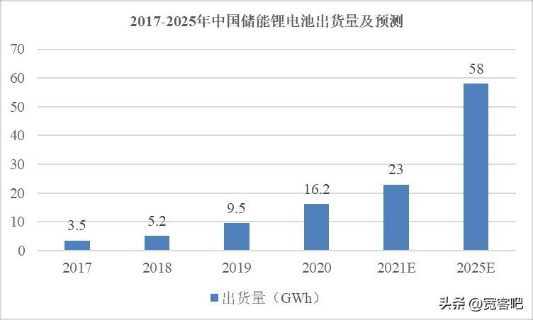 據(jù)GGII統(tǒng)計(jì)數(shù)據(jù)顯示,2020年中國(guó)儲(chǔ)能電池市場(chǎng)出貨量已由2017年的3.5GWh飛速增長(zhǎng)至16.2GWh,年復(fù)合增長(zhǎng)率66.65%。未來(lái),隨著相關(guān)配套政策實(shí)施,疊加新能源并網(wǎng)、發(fā)電側(cè)新能源消納市場(chǎng)需求提升、5G商業(yè)化應(yīng)用落地等因素影響,我國(guó)儲(chǔ)能鋰電池市場(chǎng)將進(jìn)一步擴(kuò)大,預(yù)計(jì)到2025年,我國(guó)儲(chǔ)能鋰電池出貨量將達(dá)到58GWh。