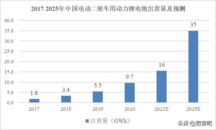GGII預(yù)計(jì)2020-2025年期間,我國(guó)電動(dòng)二輪車(chē)用動(dòng)力鋰電池出貨量將增至35GWh,年復(fù)合增長(zhǎng)率29.26%。